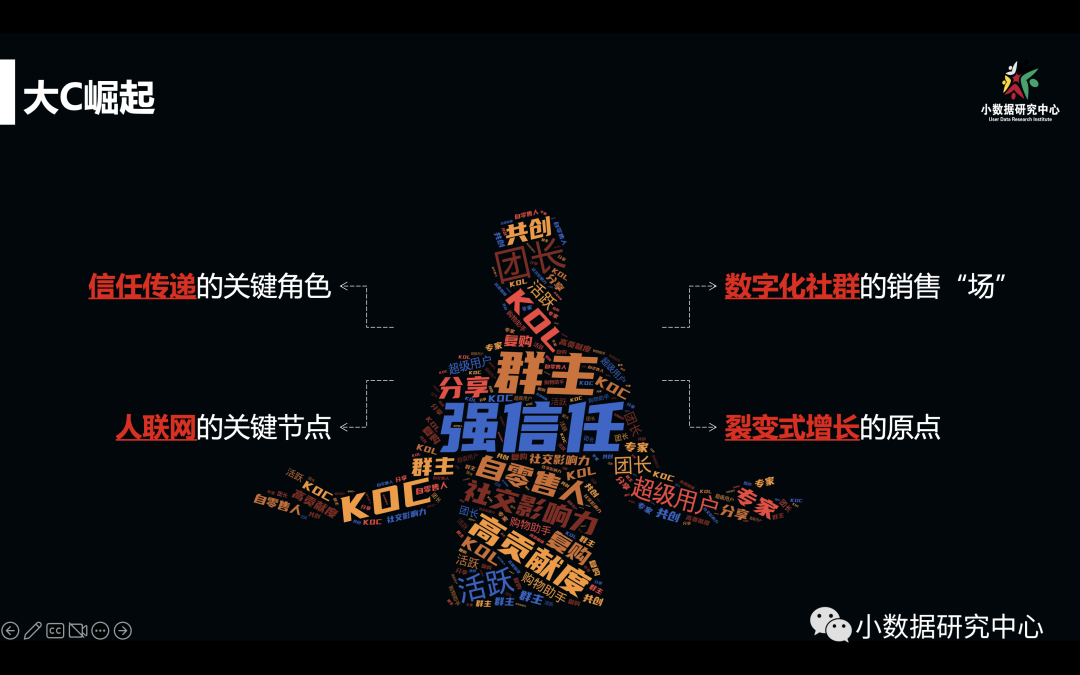 大C是商業(yè)元生態(tài)中承上啟下的關(guān)鍵一環(huán),像深深扎根在土壤(信任)之中的一棵棵參天大樹,支撐著整個生態(tài)和諧穩(wěn)定地運(yùn)行。因為有大C的存在,強(qiáng)用戶關(guān)系、“去中心化”、分布式管理、社群裂變才得以出現(xiàn)。