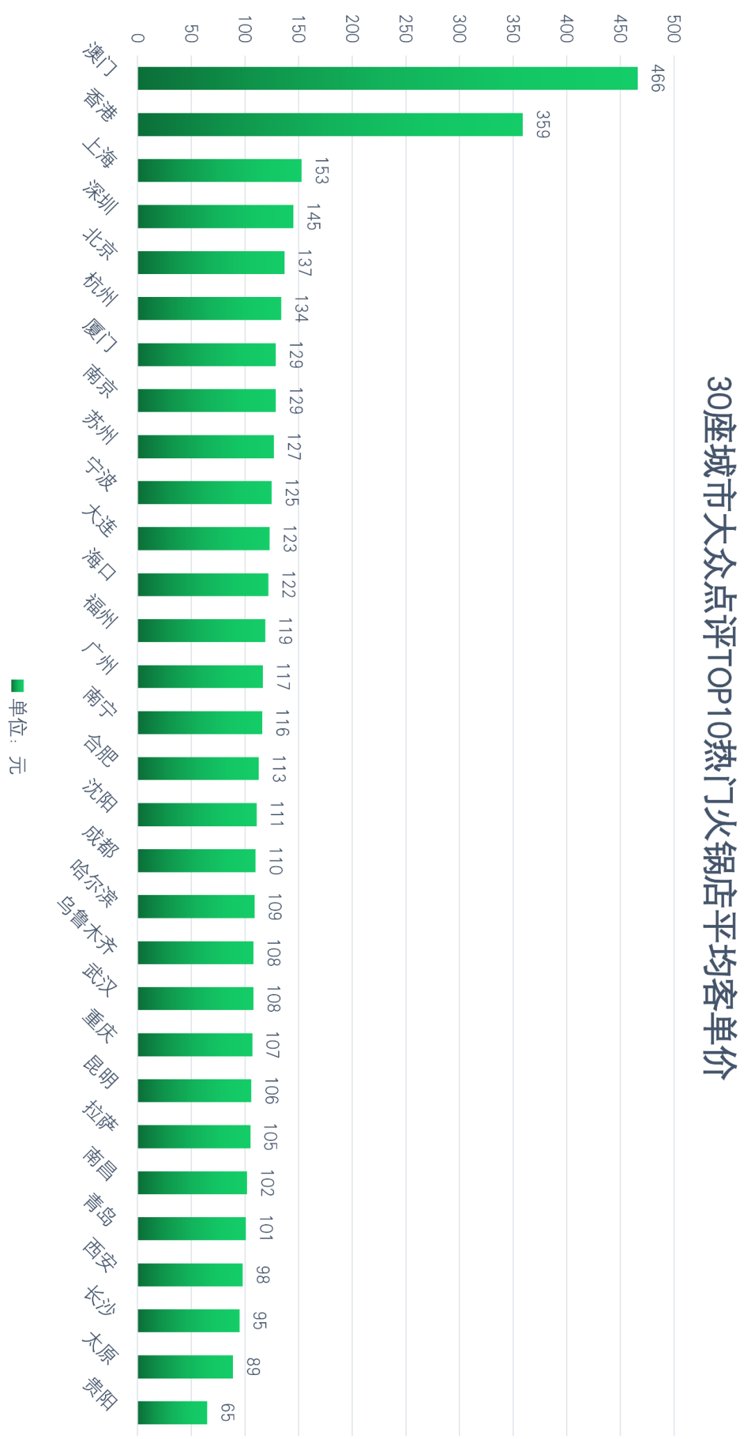 從30座城市大眾點評TOP10熱門火鍋店的平均客單價來看,澳門以466.2元拔得頭籌,香港緊隨其后(358.9元),可見以海鮮為主食材的火鍋消費水平明顯高于其他;