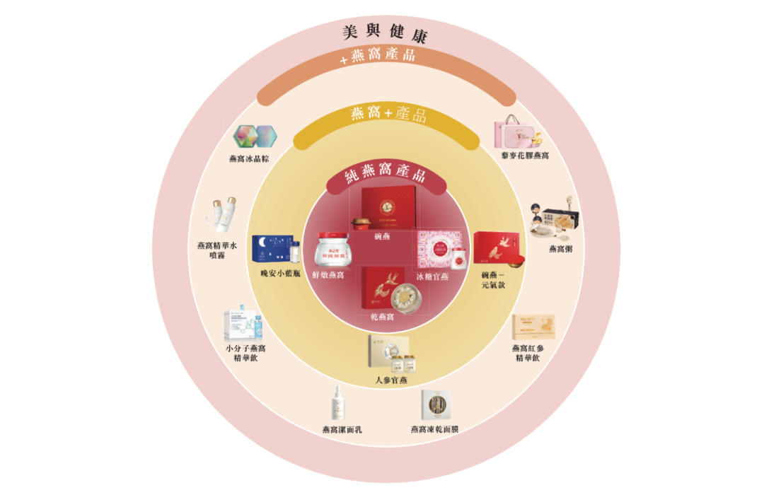 其中,純燕窩產(chǎn)品主要包括碗裝燕窩產(chǎn)品系列「碗燕」、主要供應(yīng)電商消費(fèi)者的瓶裝燕窩產(chǎn)品系列「鮮燉燕窩」、瓶裝冰糖口味燕窩產(chǎn)品系列「冰糖官燕」、可供客戶自行加工的傳統(tǒng)燕窩產(chǎn)品系列「干燕窩」等;「燕窩+」產(chǎn)品指以燕窩為基底、添加了額外成分以增強(qiáng)風(fēng)味及適應(yīng)不同消費(fèi)場(chǎng)景的燕窩產(chǎn)品;而「+燕窩」產(chǎn)品則包括使用燕窩或燕窩提取物以增強(qiáng)風(fēng)味和功能的食品(如燕窩粥)、以及使用燕窩肽作為核心成分的燕窩護(hù)膚品。