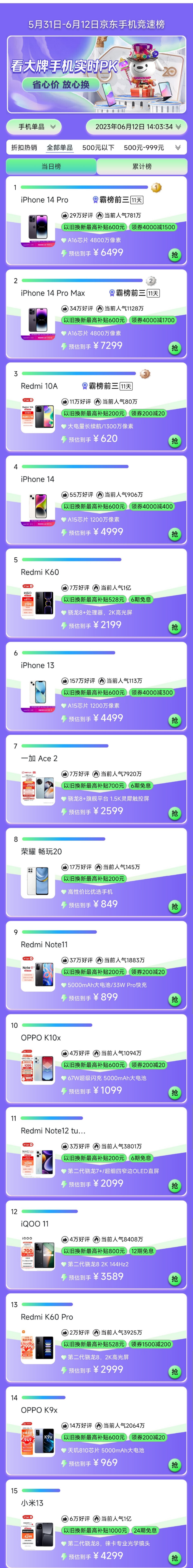但從價位來看,本次618用一句話總結(jié)還是“蘋果吃飽飽,國產(chǎn)廠商跟著跑”。榜單前二的iPhone14 Pro和iPhone14 Pro Max售價分別為6499元和7299元,但排名第三的redmi 10A的售價卻僅為620元,兩者對比價格相差了10倍。整個前十里,安卓廠商以千元機居多,唯二的兩款中端機型則是小米榮耀——Redmi K60和一加 Ace 2。