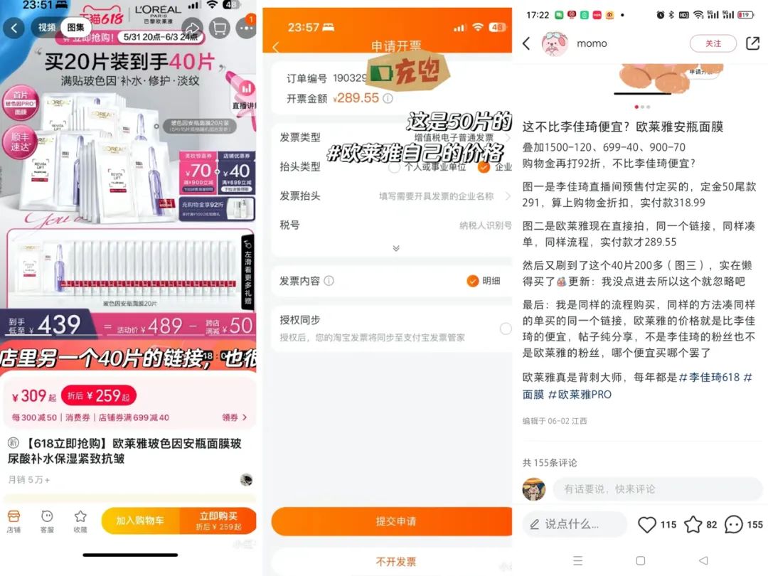 直播當天,消費者在李佳琦直播間的成交價格為429元(買20片贈送30片),歐萊雅官方自播間的成交價則是257元,差價高達172元。