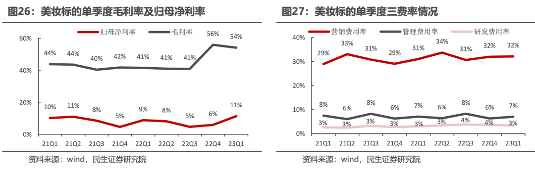 從2021年Q1到2023年Q1累積9個季度中,美妝標的公司的毛利率位于44-56%區(qū)間,而歸母凈利率則在5-11%區(qū)間震蕩。