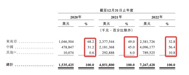 從上圖也能進(jìn)一步看到,短短三年,極兔地區(qū)收入從東南亞的7成降低至三成,中國區(qū)收入從三成增長至六成左右。此外,其它地區(qū)占比也開始貢獻(xiàn)一成。