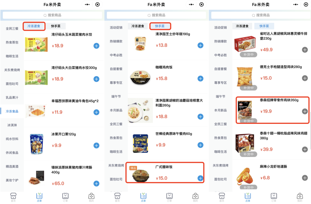 筆者登陸“全家線上外賣”微信小程序發(fā)現(xiàn),全家將預制菜品類劃分為冷凍食品的二級菜單的冷凍速食及快手菜,共計32個商品中有14個商品處于“補貨中”狀態(tài),廣式臘味飯則被重點貼上了“爆款”標簽。