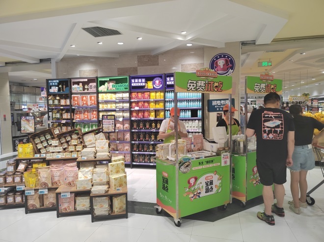 門店特色商品RT100近70個(gè)品類,包括大黃魚、臺(tái)灣風(fēng)味腸、核桃糕、瑞士卷、云朵麻薯、呷無忌小青檸、薈尚大米等。此外,店內(nèi)也設(shè)置了適合健身人士的低脂健康區(qū),售賣低脂雞胸肉、輕鹽肉制品、0糖0脂氣泡水等超130 種健康美食,另外也有長春當(dāng)?shù)刂放起┰屡H馊腭v。開業(yè)第一天上新爆款商品深海捕撈空運(yùn)直達(dá)的波士頓龍蝦,回購率超高的哈了個(gè)蜜,香甜可口的泰國金枕榴蓮。