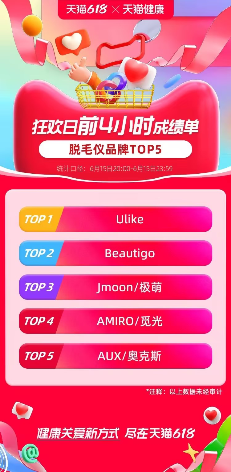 分品牌來(lái)看,2023年1月1日起,強(qiáng)脈沖光家用脫毛儀按第二類醫(yī)療器械管理,Ulike在該領(lǐng)域的行業(yè)第一地位依舊難以撼動(dòng)。來(lái)自天貓的數(shù)據(jù)顯示,狂歡首日4小時(shí),Ulike延續(xù)過(guò)往優(yōu)勢(shì)地位,繼續(xù)穩(wěn)居天貓平臺(tái)健康行業(yè)TOP1,并且截至6月18日的數(shù)據(jù)顯示,Ulike成為脫毛儀類目線上全渠道第一。