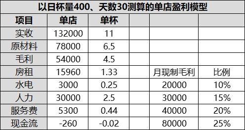 若是將成本納入考量,以一家單日杯量能達(dá)400杯的門店來測算,在扣除掉原材料、人力、房租、水電等一系列成本,以及上交給總部的服務(wù)費(fèi)之后,賬上的現(xiàn)金流只剩下-260元。