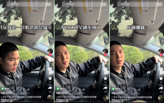 抖音上名為“餐飲阿光”的創(chuàng)業(yè)者就是其中一員。他原本的第一選擇是瑞幸,但因?yàn)樗趨^(qū)域的瑞幸已經(jīng)不開放加盟了,又選擇了幸運(yùn)咖,但因不符合幸運(yùn)咖要求,他才選定了以為是瑞幸“好兄弟”的庫迪。
