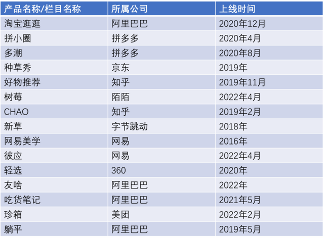 還有一個(gè)很經(jīng)典的例子是小紅書。自從小紅書的種草模式興起后,各大電商巨頭都開始對(duì)小紅書的模仿。比如阿里的“躺平”“吃貨筆記”,京東的“種草秀”,拼多多的“拼小圈”“多潮”,抖音的“新草”“可頌”“有柿”等等。