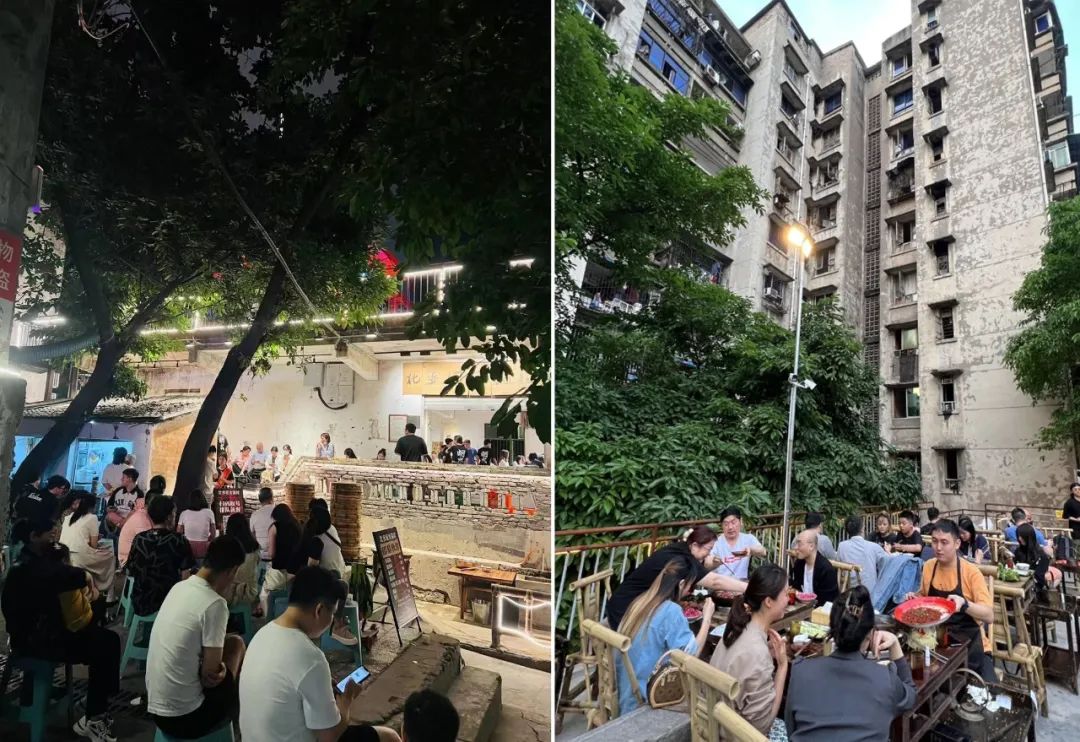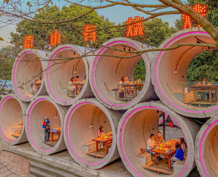 重慶南山一家燒烤店,把9個水泥管堆成了上下兩層,每個管道都像獨立的包間,上層視野開闊,適合觀光,下層舒適性更高,被網(wǎng)友戲稱“這才是真正的'下管子'”。