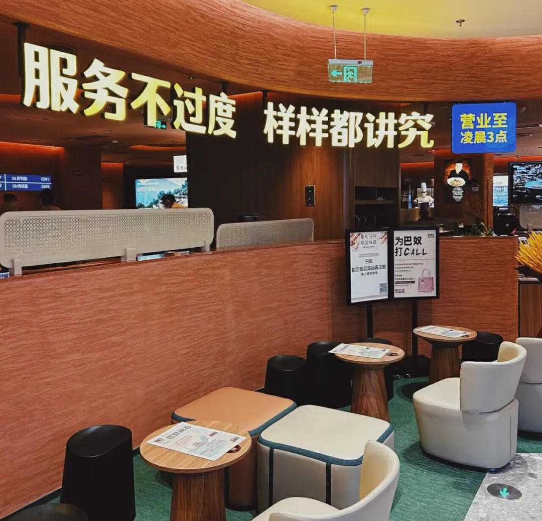 還有巴奴亦在追求回歸自然,其去年升級的蘇州店,采用由泥、沙、石組成的夯土墻,呈現(xiàn)質(zhì)樸之感,再運用古銅臺上鍋、陶土餐具等進一步來強化這種自然之感,就像官方所說“給人以親近自然的愜意”。
