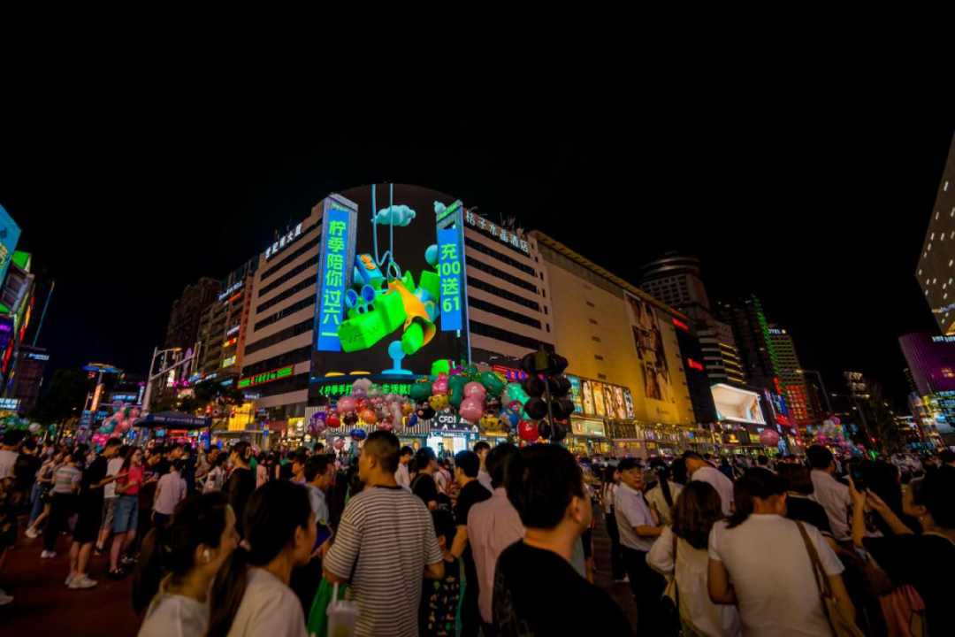海:晚上8點(diǎn)鐘,長(zhǎng)沙人潮洶涌的五一廣場(chǎng),“小鱷雷蒙”空降大屏,“檸季陪你過(guò)六一,充100送61”,裸眼3D的新奇畫面引來(lái)無(wú)數(shù)人拍照。