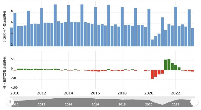 2010年至2023年,梅西百貨季度銷售額和同比銷售額百分比變化。數(shù)據(jù)來源:macrotrends