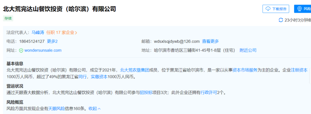 天眼查信息顯示,“乳此新鮮”奶茶店由北大荒完達(dá)山餐飲投資(哈爾濱)有限公司授權(quán),該公司成立于2021年,在哈爾濱含有17個分店機(jī)構(gòu)。