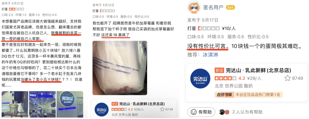 用戶反饋挑明了真實的消費(fèi)現(xiàn)狀,在“乳此新鮮”北京首店的大眾點評下,也有不少消費(fèi)者直言性價比太低,“想著支持國產(chǎn)品牌卻被割韭菜”“毫無性價比可言”。
