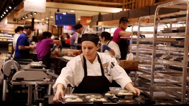 疫情期間,首家位于West Cary地區(qū)的韋格曼斯門店開業(yè)后,成千上萬名消費者涌入店內。烘焙區(qū)新鮮出爐的桃子塔餅,及漢堡吧的定制漢堡被一搶而空。據(jù)統(tǒng)計,食品服務占據(jù)了韋格曼斯年銷售額的大約10%,接近100億美元。