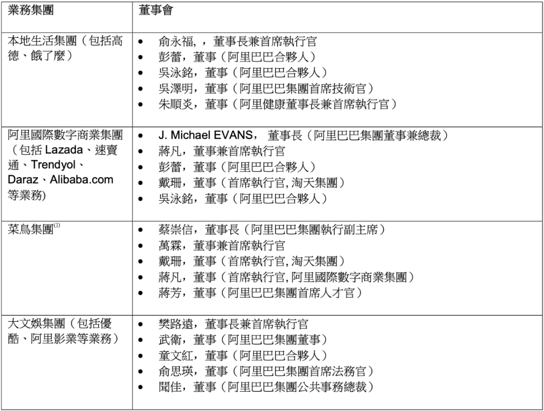 阿里巴巴集團(tuán)六大業(yè)務(wù)集團(tuán)的董事會(huì)成員
