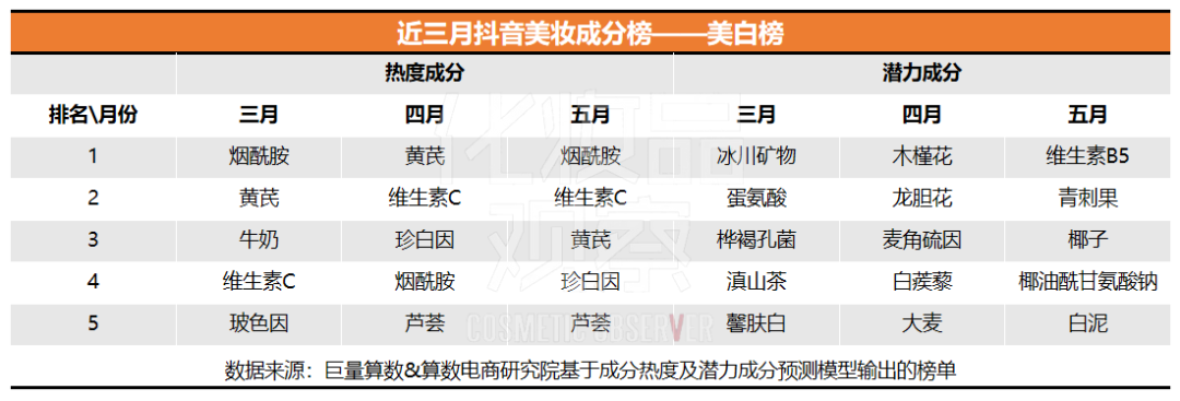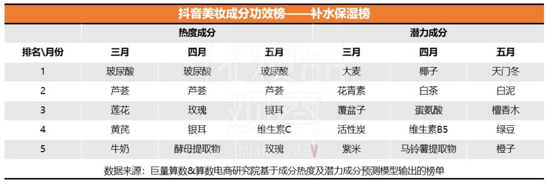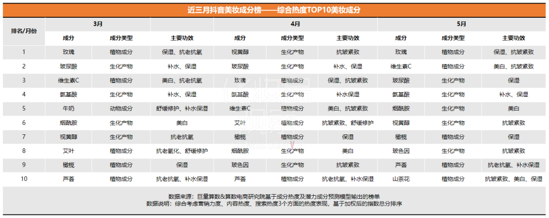 今年以來,巨量算數(shù)&算數(shù)電商研究院基于成分熱度及潛力成分預(yù)測模型,陸續(xù)發(fā)布了抖音美妝成分榜,化妝品觀察梳理了3、4、5月的抖音美妝成分榜,本文將圍繞熱度榜和潛力榜、品類榜、功效榜三大板塊展開,呈現(xiàn)抖音美妝成分市場趨勢。