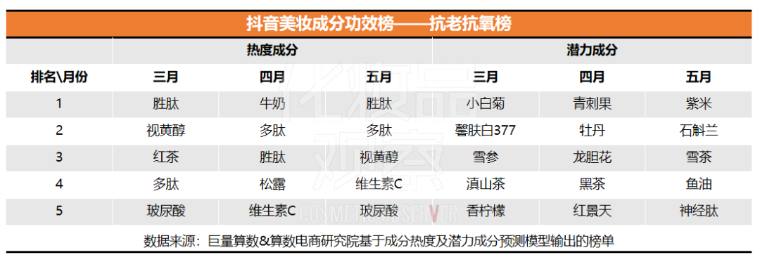 1、抗衰“三巨頭”中的玻色因落榜。玻色因、視黃醇、勝肽被大眾并稱為抗衰“三巨頭”,從榜單來看,勝肽在3月和5月均居榜首,4月排名第三,此外接連上榜的多肽,在4月和5月排名第二,視黃醇在3月和5月也均有上榜,但玻色因在抖音連續(xù)三個(gè)月均未進(jìn)入抗老抗氧榜單前五名。