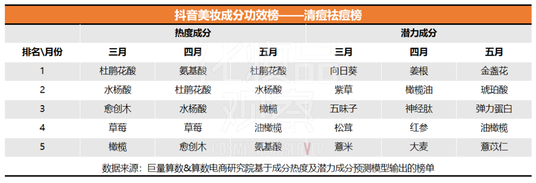 2、保濕、舒緩修護(hù)成分與祛痘功效相輔相成。除了常見的主打祛痘功效的成分外,3-5月祛痘熱度榜也出現(xiàn)了清潔、保濕、舒緩修護(hù)的成分,比如愈創(chuàng)木、橄欖、草莓、氨基酸均是兩次上榜。