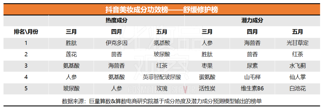 1、僅艾葉、咖啡因兩次上榜。與相對穩(wěn)定的熱門成分不同,潛力成分每月變化較快,比如3月上榜的石斛、水母、愈創(chuàng)木等成分,4月和5月均落榜。而3月排名第四的艾葉,在4月位列第五,咖啡因在4月和5月均躋身TOP10榜,彰顯出了一定潛力。
