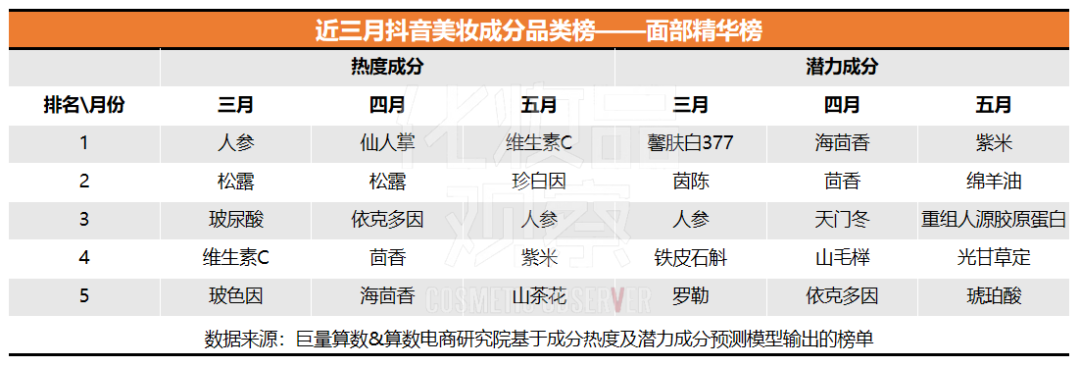 1、人參、松露兩登熱度榜!肮πе蔡帷背煞种,“食物成分”多次上榜,3月雪花秀第六代潤致煥活肌底精華液(人參肌底液)上新,帶動(dòng)“人參”,登頂面部精華熱度榜榜首及潛力榜第三,5月人參成分排名第三。松露連續(xù)兩個(gè)月均排名第二。