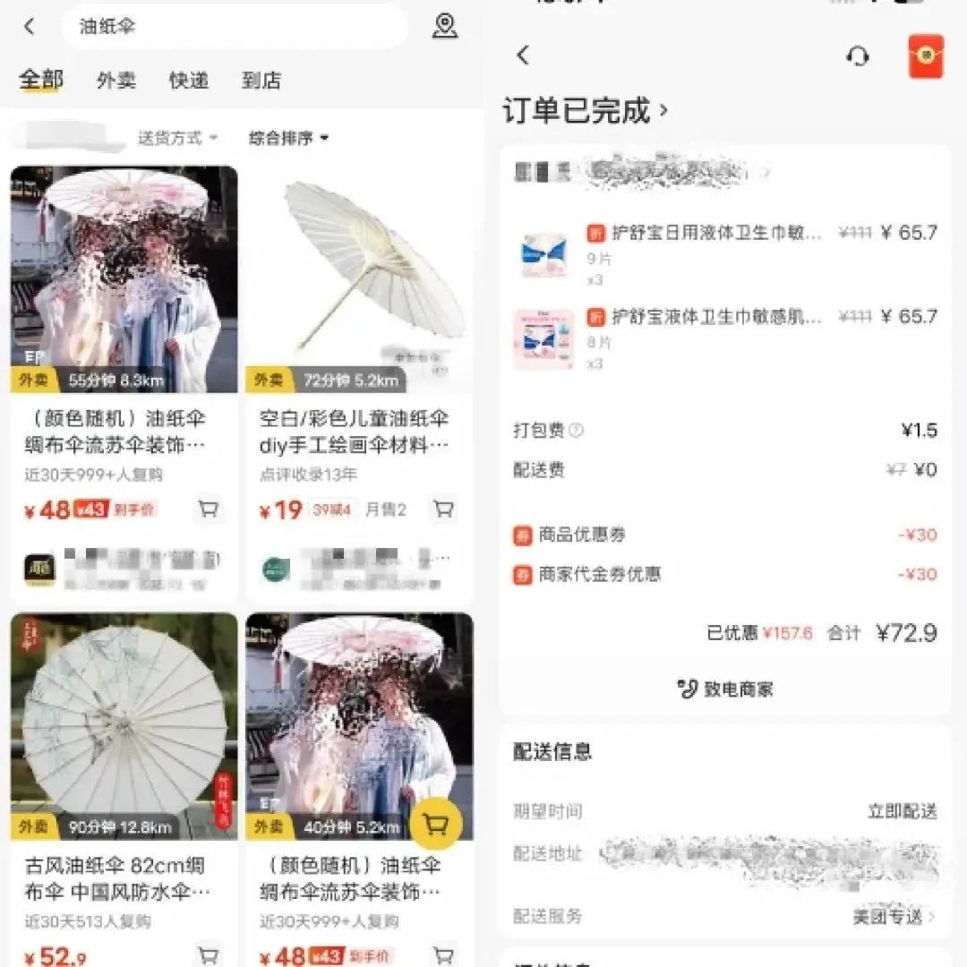 圖/舞蹈室同學(xué)通過(guò)美團(tuán)外賣(mài)搜索“油紙傘”產(chǎn)品(左)