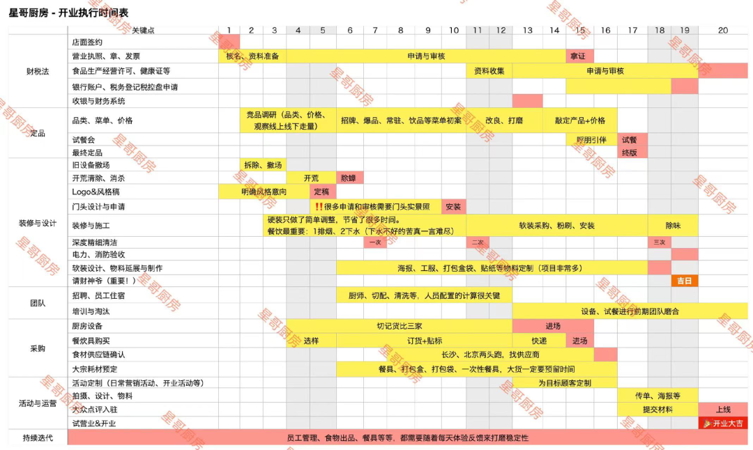 Juliet和小貓的星哥廚房,只用了20天就把店開了出來。一張詳盡的開業(yè)執(zhí)行表,列明了財稅法、定品再到團隊、運營、迭代等各個方面的具體事項。