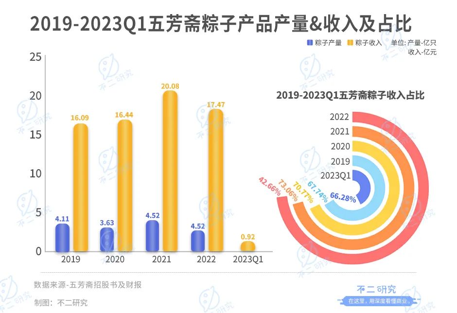 招股書及財(cái)報(bào)顯示:2019-2022年及2023年一季度,粽子產(chǎn)品收入分別為16.09億元、16.44億元、20.08億元、17.47億元和9216.94萬元,占五芳齋主營業(yè)務(wù)收入的比例分別達(dá)67.74%、70.77%、73.06%、70.97%和42.66%。