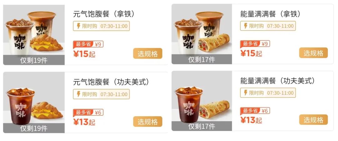 元?dú)怙柛共停描F/功夫美式)、能量滿(mǎn)滿(mǎn)餐(拿鐵/功夫美式),分別搭配芝香火腿可頌與芝香火腿牛肉卷,小程序點(diǎn)單疊加優(yōu)惠,售價(jià)大都在13元~20元之間。