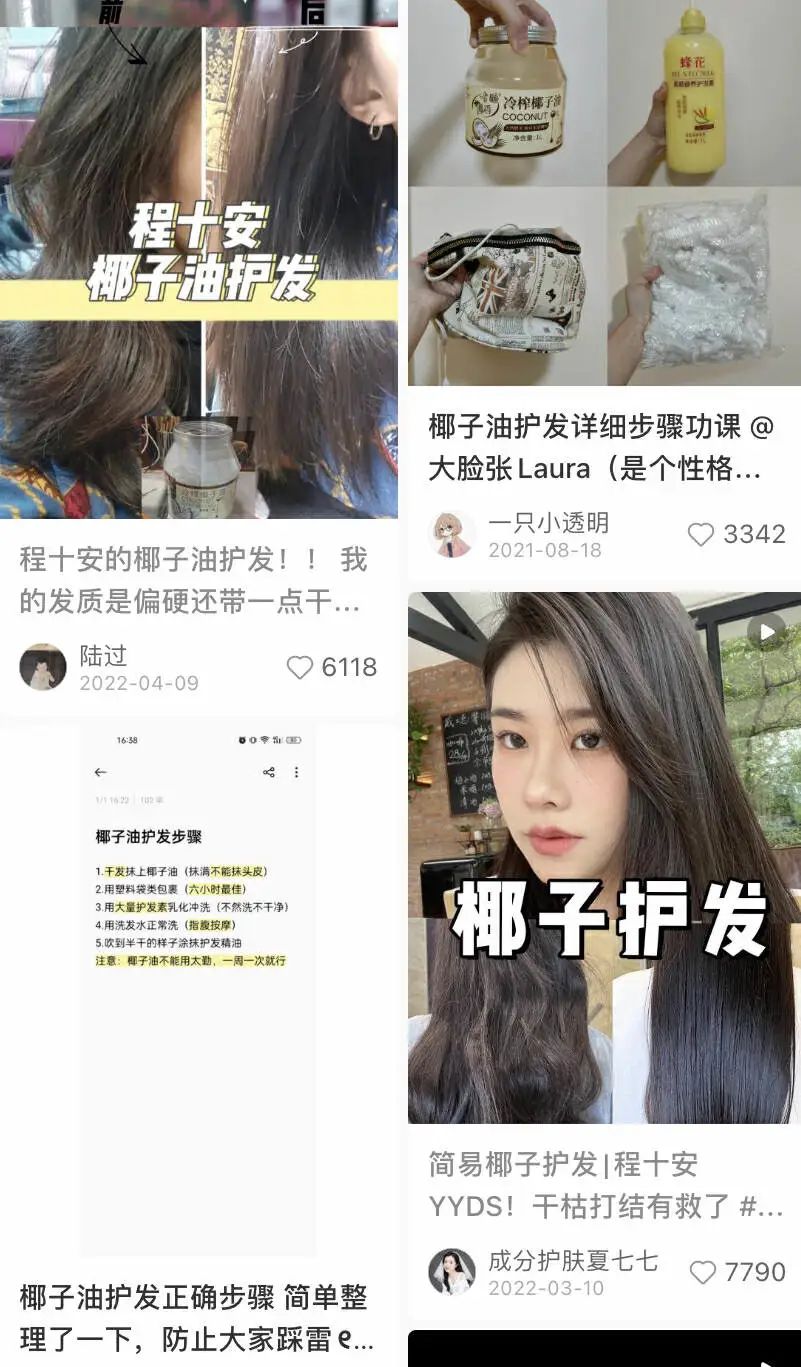 這個方法能火起來,少不了網(wǎng)紅程十安的推薦!罢饶闶旮煽蓊^發(fā)的妙方”“富家千金的氛圍感秘訣”……在小紅書,有關(guān)椰子油護(hù)發(fā)的筆記超過1萬篇。