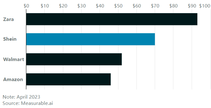 訂單價(jià)值方面,今年4月,SHEIN在美國(guó)的平均訂單價(jià)值約為70美元,Zara為93美元,沃爾瑪為52美元,亞馬遜為46美元。