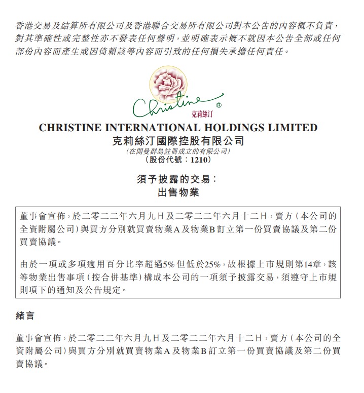 公告顯示,克莉絲汀這次出售的兩處物業(yè),一處位于上海西藏南路1431號(hào)1、2層整層,建筑面積為257.96平方米、作辦公用途;另一處位于上;菽湘(zhèn)人民東路2693、2695、2729弄4號(hào)202室,建筑面積為214.32平方米,為住宅用途。