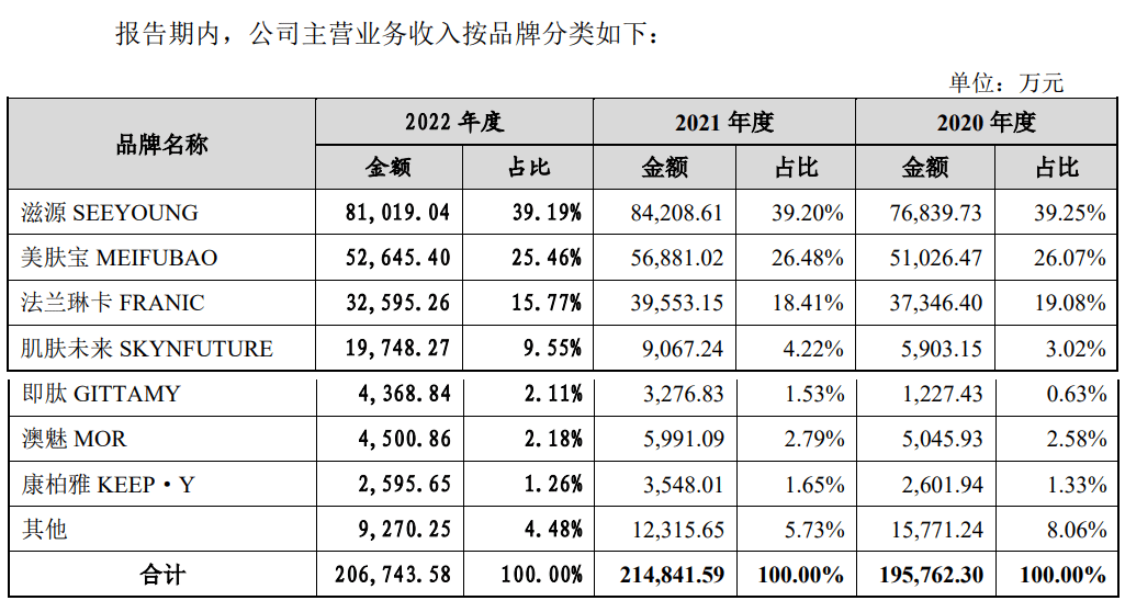 具體品牌上,滋源、美膚寶和法蘭琳三大品牌2022年貢獻(xiàn)了80.42%,其中滋源2022年營收8.1億元,將成為集團(tuán)第一個破10億的品牌。