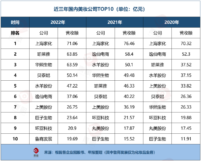 隨著環(huán)亞公布2022年數(shù)據(jù),青眼發(fā)現(xiàn)本土美妝十強(qiáng)的名次也發(fā)生了變化,環(huán)亞排名第九,而丸美股份掉出十強(qiáng)榜單。不過,對比2020-2021年第八的名次,環(huán)亞降了一名。