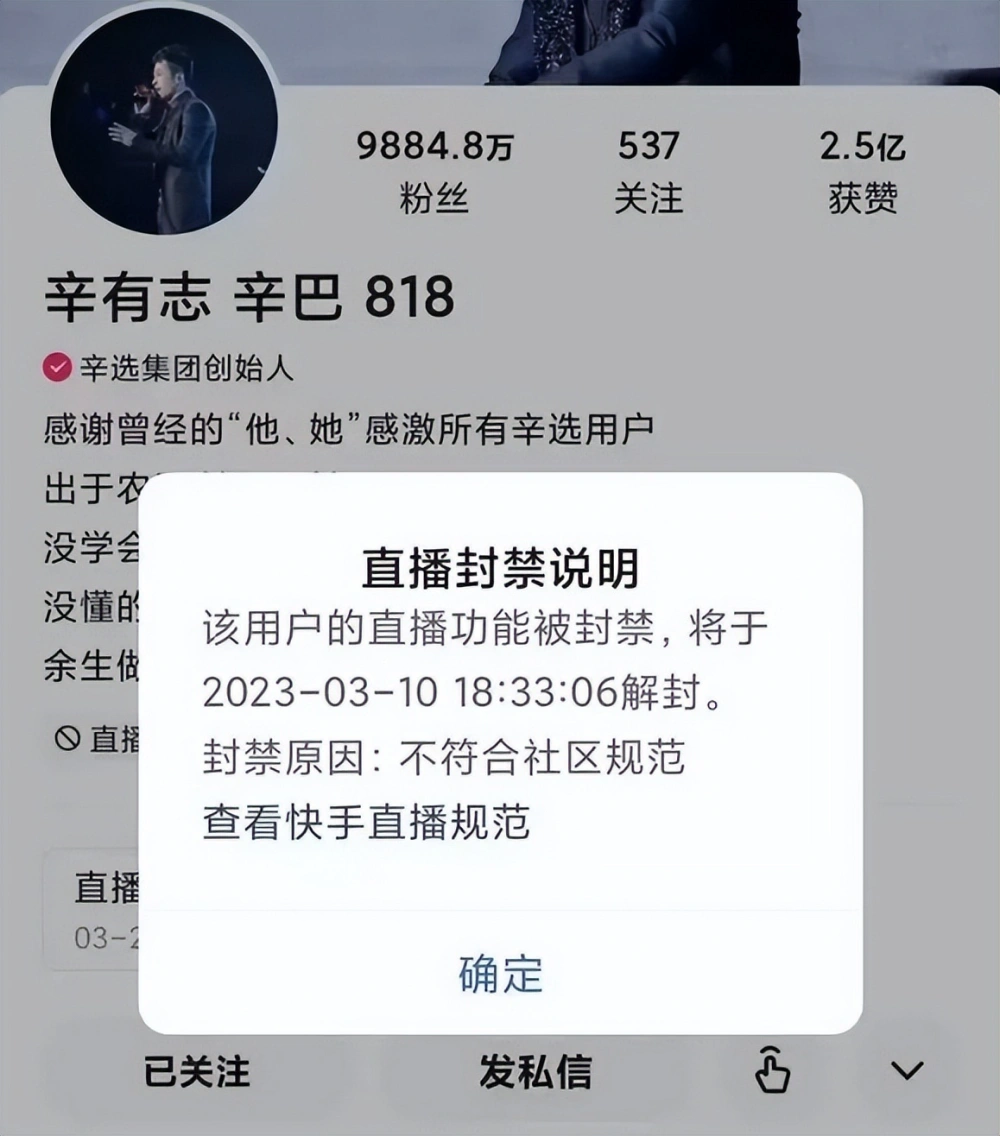 2021年8月,因直播間圍觀粉絲太少,辛巴怒懟平臺稱自己花了2500萬買流量卻被不公平對待,還喊話快手高層不要薅主播羊毛,之后辛巴被平臺封禁一周。