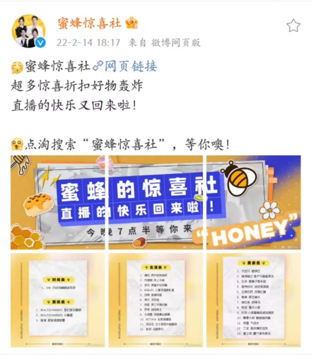 為承接薇婭直播間無處可去的龐大流量,2022年2月12日“蜜蜂驚喜社”直播間在淘寶高調(diào)上線,6個月后,蜜蜂歡樂社、蜜蜂心愿社陸續(xù)上線。
