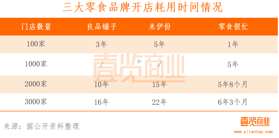 零食很忙自2017年首家店開業(yè)后,開業(yè)速度一直被行業(yè)關(guān)注。從1到1000只用了5年時(shí)間,自門店突破1000家后,便開始了拓展提速。從1000家到2000家只用了8個(gè)月,2000家到3000用了7個(gè)月。而傳統(tǒng)零食連鎖品牌來(lái)伊份和良品鋪?zhàn)訌?到3000,分別用了22年和16年。