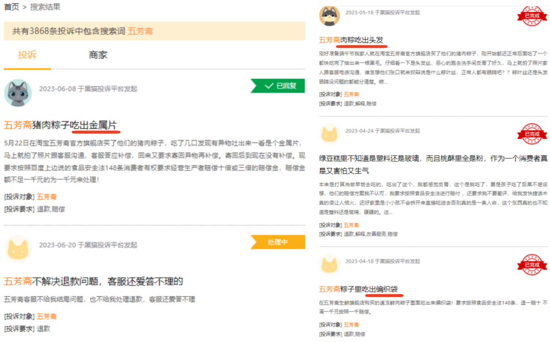 筆者在黑貓投訴平臺(tái)內(nèi)搜索“五芳齋”,可檢索到3868條投訴。其中不少消費(fèi)者反反映在粽子內(nèi)吃出金屬片、頭發(fā)、塑料等異物。