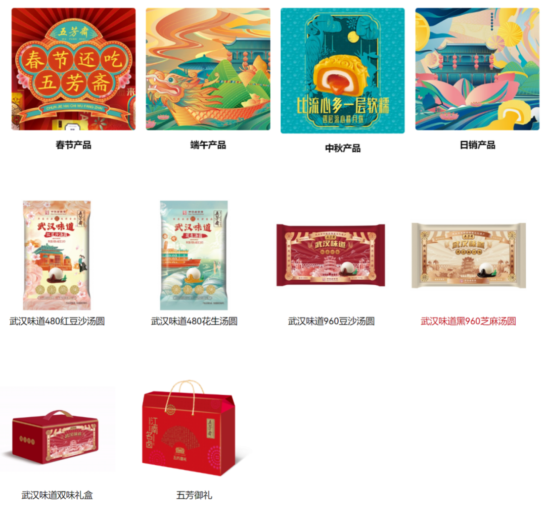 目前,五芳齋產(chǎn)品線分為四大類,前三類為包括春節(jié)、端午和中秋的節(jié)日產(chǎn)品,除了常見的年貨糕點(diǎn)、鹵味禮盒等產(chǎn)品外,還有如八寶飯、雜糧、湯圓、細(xì)點(diǎn)等多種類的預(yù)制品產(chǎn)品;其余則為日銷產(chǎn)品。