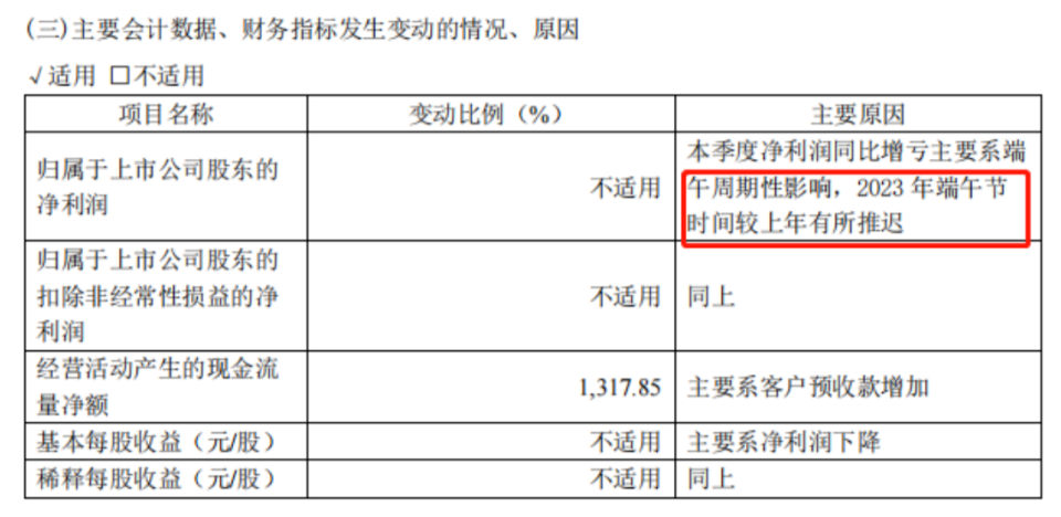 此外,五芳齋的盈利狀況也不甚理想,該季度凈虧損高達(dá)6393萬元。對(duì)此,五芳齋解釋稱由于端午節(jié)時(shí)間較上一年推遲,導(dǎo)致端午節(jié)的銷售高峰延遲,出現(xiàn)虧損情況。