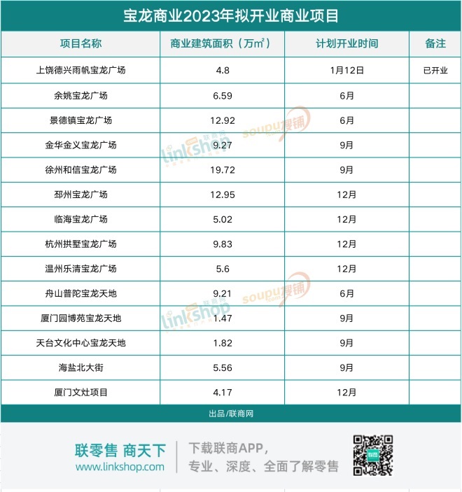 同時,2022年寶龍商業(yè)新開了臺州椒江寶龍城、廈門同安寶龍廣場等8個商業(yè)項目。截至2022年12月31日,寶龍商業(yè)共有93個已開業(yè)零售商業(yè)物業(yè),總已開業(yè)建筑面積約為1055萬平方米。