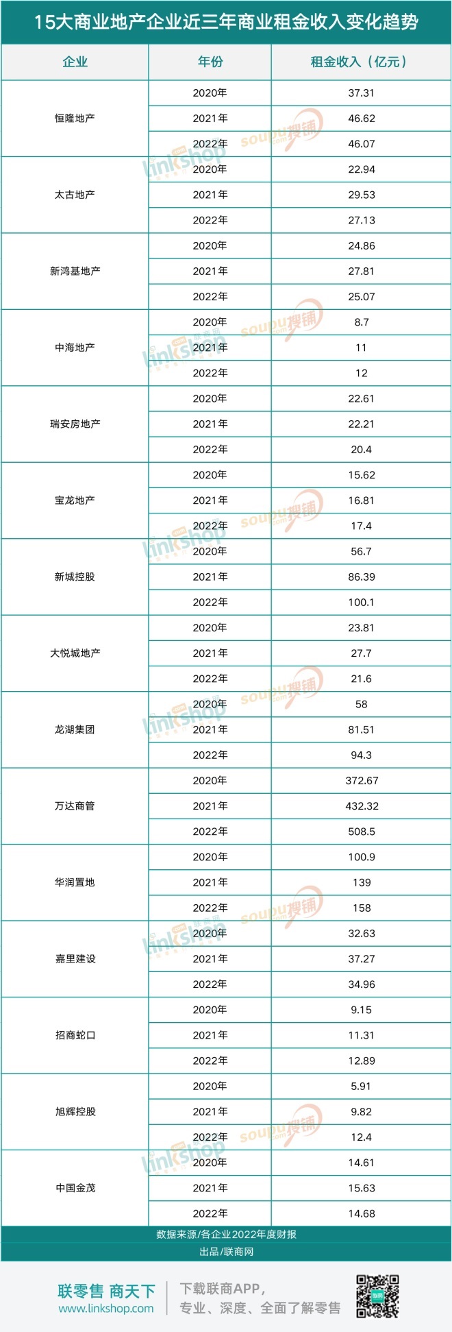 隨著各大商業(yè)地產(chǎn)企業(yè)2022年年報公布,其商業(yè)物業(yè)的租金收入情況也相繼出爐。聯(lián)商網(wǎng)零售研究中心統(tǒng)計了15家重點商業(yè)地產(chǎn)企業(yè)(除萬達商管外,其余均為上市公司;諸如九龍倉集團、萬科及印力等未公開購物中心租金收入的企業(yè)未在統(tǒng)計中)的2022年租金收入情況,以供行業(yè)參考。