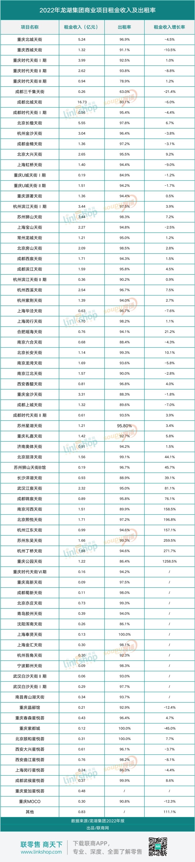 截至2022年12月31日,龍湖集團已開業(yè)商場建筑面積為722萬平方米(含車位總建筑面積為927萬平方米),整體出租率為93.9%。2022年,龍湖商業(yè)旗下商場營業(yè)額為423億元;全年平均日客流200萬人次。截至2022年12月,龍湖商業(yè)已布局國內(nèi)30+座城市;截至今年4月30日,龍湖在全國18座城市開業(yè)運營商場數(shù)量達到78座。