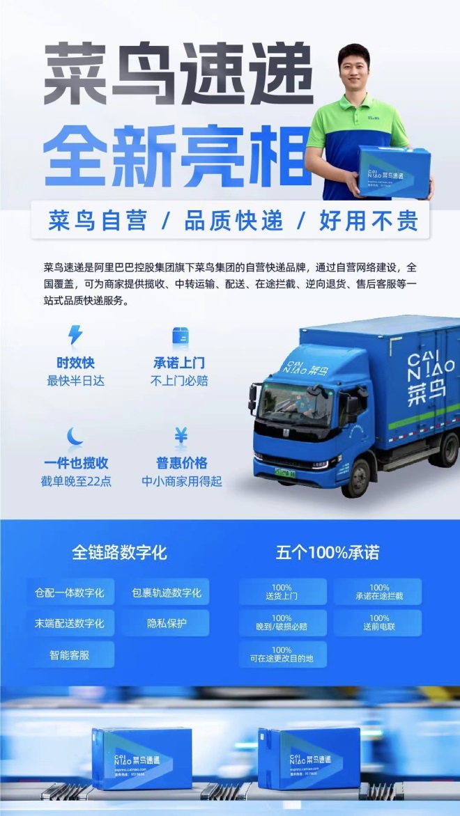 據(jù)菜鳥方面介紹,菜鳥速遞歷經(jīng)六年打造,由服務天貓超市的配送業(yè)務升級為全國快遞網(wǎng)絡,主打半日達、當次日達、送貨上門和夜間攬收等品質服務,在全國近300城提供晚到、破損必賠,不上門必賠,在途攔截和在途更改目的地等五個100%承諾。