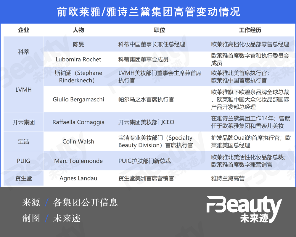 作為全球美妝賽道上的頭部企業(yè),歐萊雅集團(tuán)、雅詩(shī)蘭黛集團(tuán)也在持續(xù)為行業(yè)輸出管理人才。在今年上半年的二十余起國(guó)內(nèi)外美妝集團(tuán)人事變動(dòng)中,有9人均有在這兩大美妝集團(tuán)工作的經(jīng)歷。
