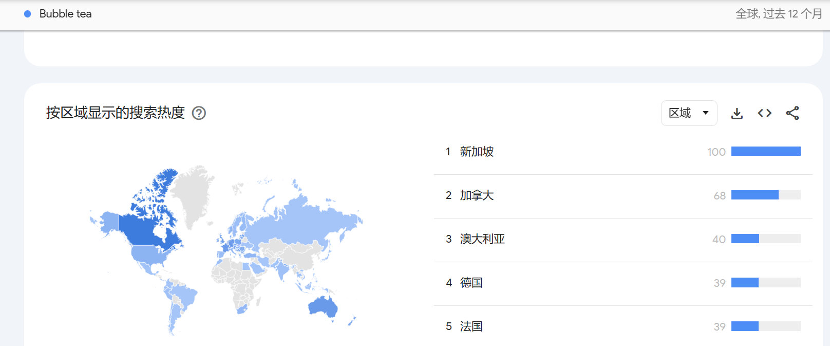 壹覽商業(yè)使用谷歌趨勢(shì)搜索發(fā)現(xiàn),輸入關(guān)鍵詞“Bubble tea(珍珠奶茶)”,熱度前五的國(guó)家有三個(gè)是歐美發(fā)達(dá)國(guó)家。