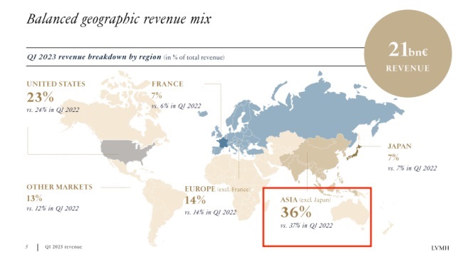 從地區(qū)來看,LVMH財報顯示第一季度,除日本以外其他亞洲地區(qū)銷售額同比增長14%,營收同比增長37%,在各地區(qū)中增幅最大。