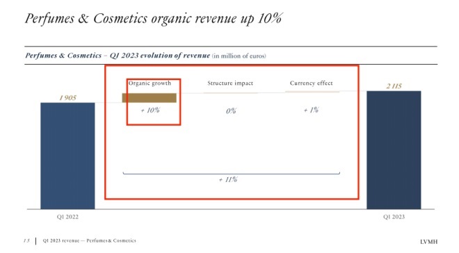 報告顯示,香水和化妝品業(yè)務(wù)集團繼續(xù)其專注于高度選擇性分銷的戰(zhàn)略,在2023年第一季度實現(xiàn)了 11% 的收入增長(+10%有機增長)。
