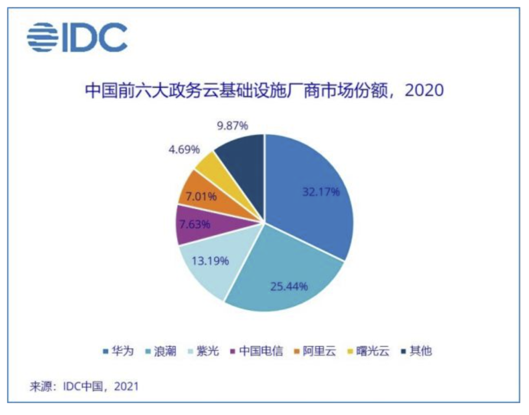 此時,華為云開始受到市場的青睞。IDC數(shù)據(jù)顯示,2020年中國政務(wù)云基礎(chǔ)設(shè)施市場份額中,華為云拿下最大一塊“蛋糕”,市占率高達(dá)32.2%,其次是浪潮的25.4%、紫光的13.2%以及中國電信的7.6%;相較之下,阿里云僅拿到了7%。
